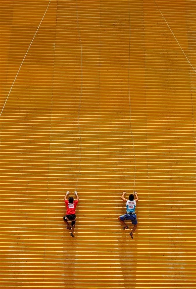 13. Абудзар Юлианто из Индонезии (слева) и Тан Нхиен Пхан из Вьетнама участвуют в скоростном подъеме в рамках Юго-восточных азиатских игр в Палембанге, Суматра. (Matt King / Getty Images)