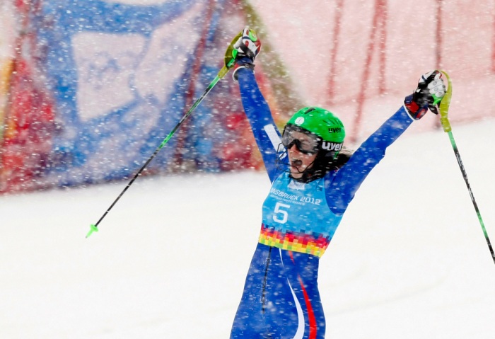 20. Петра Влхова из Словакии радуется победе после первого круга соревнования по альпийскому слалому. (Reuters)