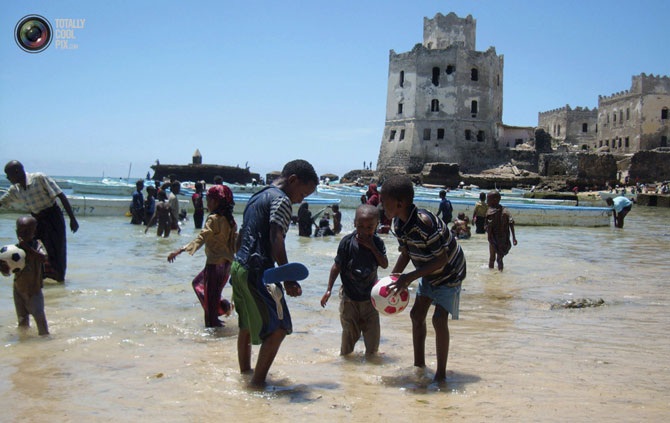 Дети играют футбольным мячом у побережья Индийского океана недалеко от столицы Сомали, Могадишо.