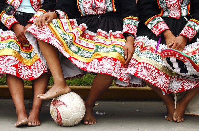 Андские футболистки ждут начала матча чемпионата Перу по футболу среди женщин-коренных жительниц в Лиме.