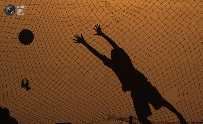 Мальчик прыгает, чтобы поймать мяч, во время игры на пляже в Луанде, Ангола.