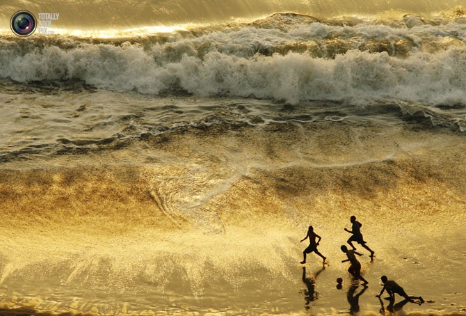 Дети играют в футбол на затопленном поле в Палаккаде, Индия.