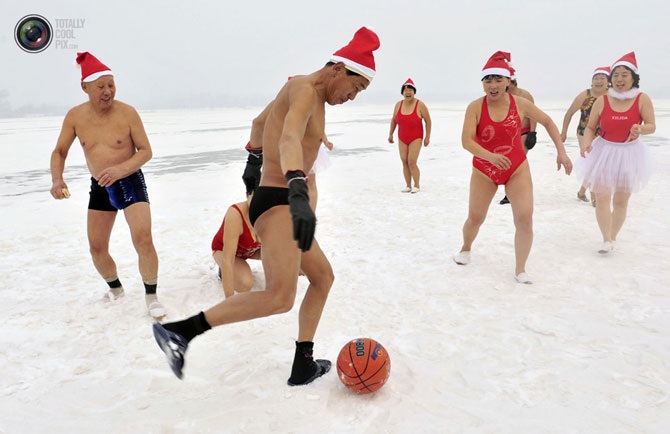 Местные жители в купальниках играют в футбол на заснеженном берегу реки Сунгари в городе Цзилинь, Китай.