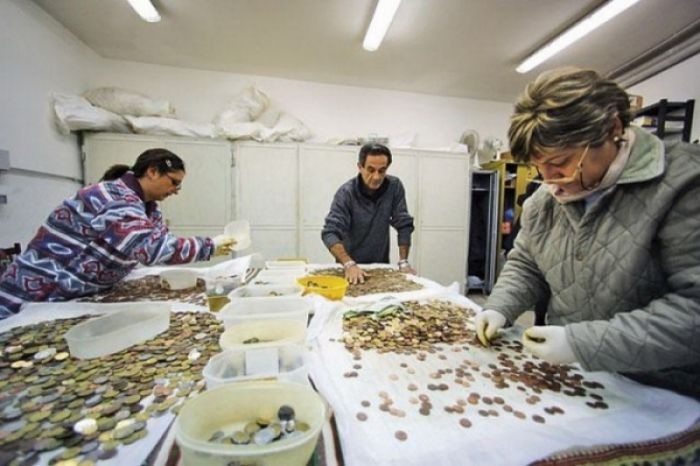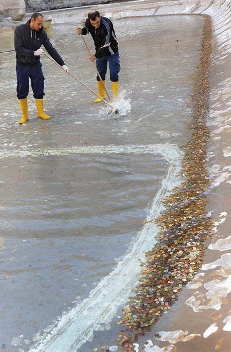 Согласно специальному указу каждая монетка становится муниципальной собственностью, стоит ей коснуться дна фонтана. Поверье о том, что турист, пожертвовавший монету Нептуну, обязательно вернется в Вечный город, делает Риму неплохую кассу. Чистильщики ежегодно достают из фонтана сотни тысяч евро. Издавна собранные средства направлялись на благотворительность. Но в этот раз власти Рима решили потратить их на нужды города — кризис, однако.