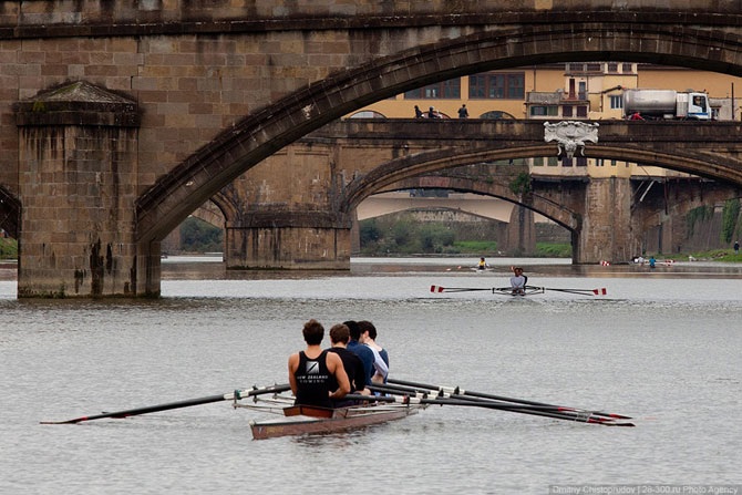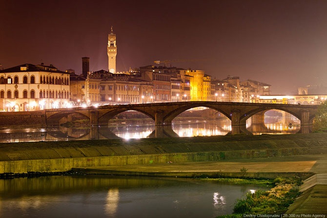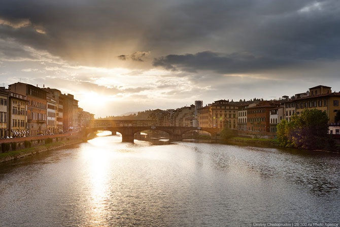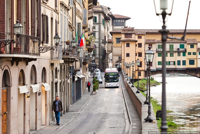 Жилые дома облепили весь берег и перебрались на старейший мост Флоренции — Понте Веккьо. Мост — построен в 1345 году и представляет из себя прочную и в то же время изящную конструкцию из трех арок. Отличительная черта Понте Веккьо — дома, теснящиеся по обеим его сторонам.