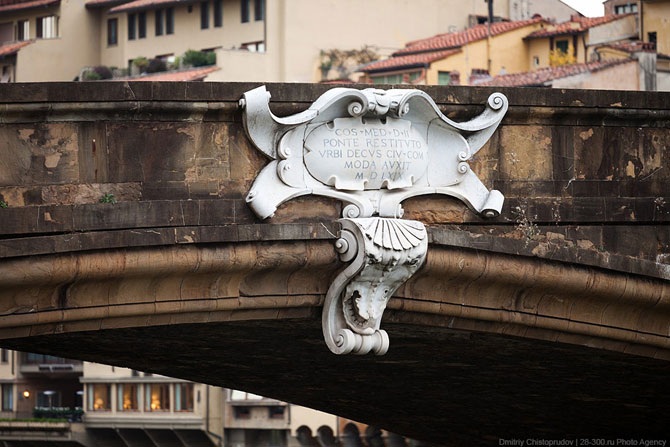 Над строениями идет Коридор Вазари, названный по имени архитектора, создавшего его специально для того, чтобы Козимо I (герцог Тосканский) мог спокойно проходить из палаццо Веккьо в палаццо Питти. Не стоит путать этот мост с «мостом менял» во Франции.
