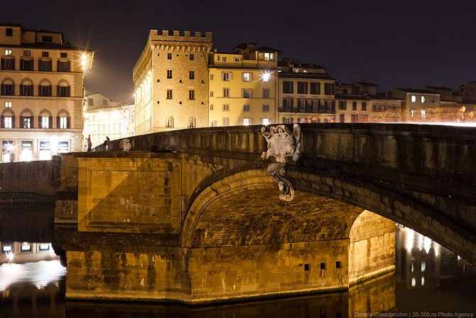 «Санта-Тринита считается самым изящным мостом Флоренции. Он был возведён в 1258 году сначала в дереве, а затем, после разрушения от наводнения в 1333 году, — в камне. Очертания этого шестипролётного моста Бартоломео Амманнати (использовавшего, возможно, проект Микеланджело) радуют глаз своими красивыми формами, овальными арками, мощными гранёными устоями, мраморными картушами и скульптурой.