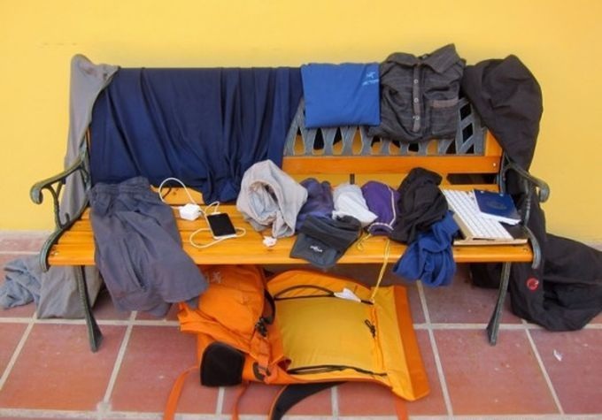 Сейчас список его собственности выглядит так: рюкзак, 2 рубашки, куртка-дождевик, футболка, шорты, полотенце, шерстяной жакет, солнцезащитные очки, бумажник, MacBook Air, iPhone 3GS, джинсы, кроссовки и набор средств гигиены.