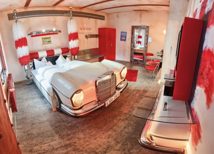 Десять номеров-люкс в четырехзвездочном отеле V8 Штутгарта посвящены различным автомобильным темам, включая кино Drive-In, мастерскую и даже автомойку. Гостевые комнаты обставлены подлинными частями автомобилей — от Morris Mini до Mercedes, чтобы любой автолюбитель мог чувствовать себя как дома.