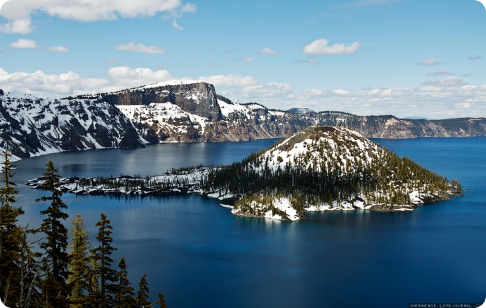 Озеро Кратер Лейк (Crater Lake) – кратерное озеро в США, штат Орегон. Это основная достопримечательность национального парка. Озеро Кратер, славится своим глубоким синим цветом и чистой водой. Максимальная глубина озера составляет 594 м, это глубочайшее озеро в США, второе по глубине в Северной Америке (самое глубокое – Большое Невольничье Озеро) и седьмое по глубине во всём мире (Байкал – самое глубокое). Образовавшееся во впадине озеро не имеет ни притоков, ни стоков. Его полностью питают только осадки и талые снега. Именно это обеспечивает исключительную чистоту воды в озере, видимость в которой составляет около 35-40 метров. Этот же факт обуславливает знаменитый цвет озера – глубокий индиго.