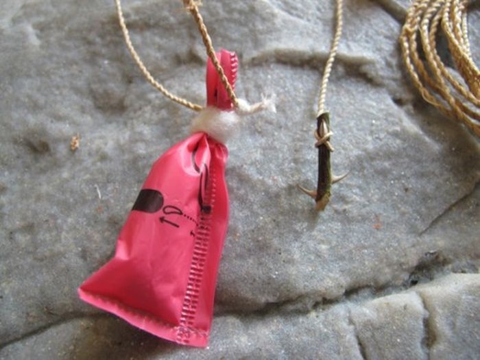 Когда под рукой есть верёвка и самодельный крючок, удочка уже почти готова. Осталось соорудить поплавок. Берём упаковку от тампона. Вскрываем, крепко перетягиваем край. Чтобы воздух, находящийся внутри, не выходил, можно добавить внутрь, на место перетяжки, немного ваты из самого тампона. Привязываем к нашей «леске»:
