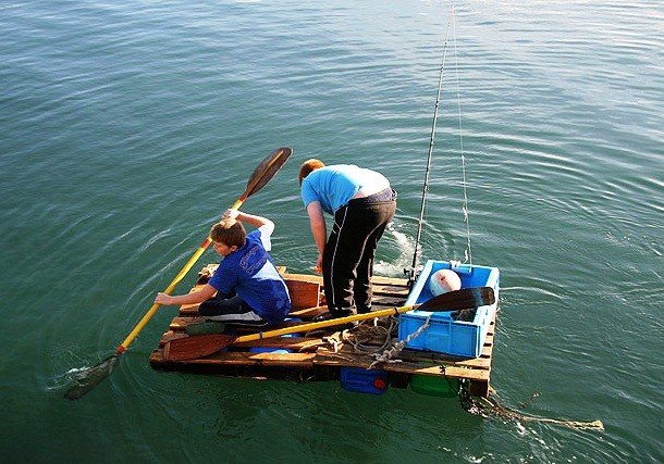 Для того чтобы сделать временный плот, разложите брезент, поставьте на него какой-либо лёгкий материал (пластиковые бутылки, ветки, кору и так далее), загните концы и свяжите всё вместе верёвкой. До того, как отправляться в долгое плаванье, убедитесь в том, что плот может выдержать ваш вес.