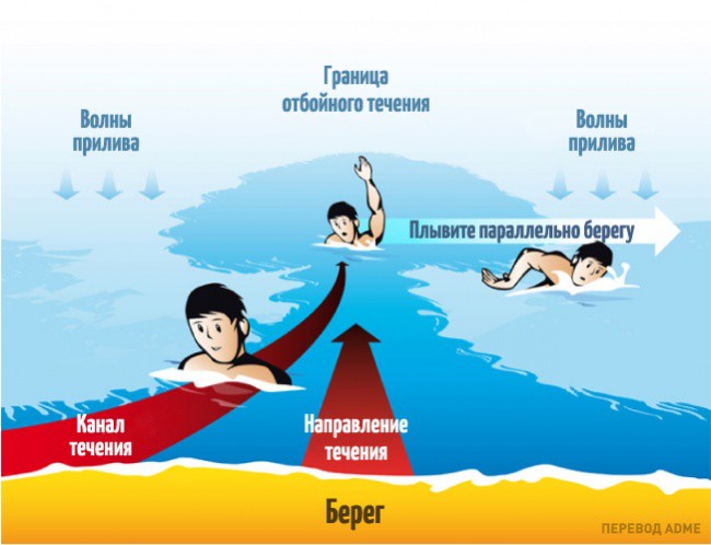 Не боритесь с течением и не гребите обратно к берегу. К сожалению, это бесполезно. Грести нужно не к берегу, а в сторону (то есть параллельно берегу). Если рип узкий (до 5 метров), вы из него быстро выйдете.