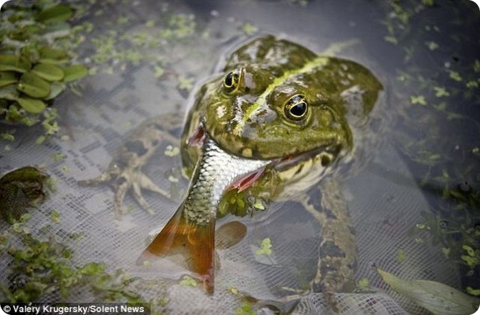 Дело было под Черниговом. Рыбина попалась в самодельные сети, расставленные на озере неподалеку от Чернигова. Тогда ее и схватила жаба около 15 сантиметров в длину. Земноводное ухватилось за рыбу лапами и запихнуло себе в пасть. По данным зоологов, лягушки действительно иногда вместо привычной своей пищи в виде моллюсков, насекомых и червей съедают мальков и даже птенцов.