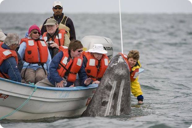 Туристы общаются с с дружелюбным калифорнийским серым китом в заливе Сан-Игнасио, Мексика.
