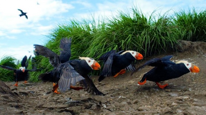На картах Камчатского края и Сахалинской области можно найти целый ряд островков и прибрежных скал-одиночек, названных в честь топорка. И традиционное место его размножения – на Командорском архипелаге, где располагается одно из самых крупных и древних поселений этих птиц, конечно, именуется остров Топорков. Ежегодно сюда слетается более 100 тысяч особей, притом что площадь самого клочка суши не превышает половины квадратного километра.