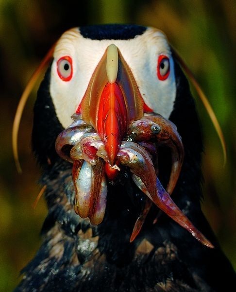 Поскольку рыбные места бывают значительно удалены от суши, топорки приносят птенцу сразу целую «охапку» рыбок, зажатых в клюве. Достоверно установленный рекорд улова – 29 рыбешек за раз!