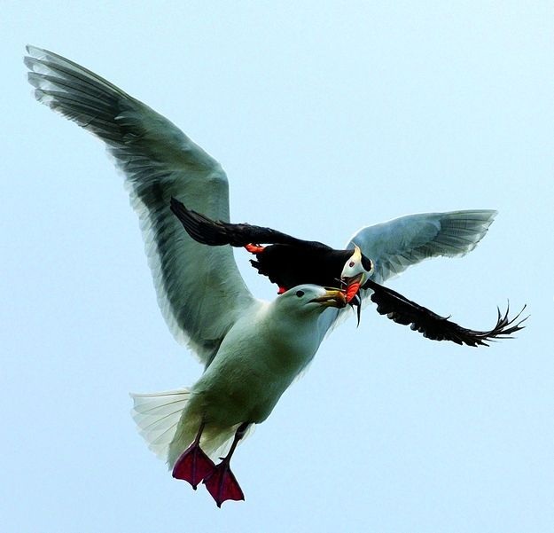 Серокрылая чайка отбирает законную добычу у топорка.