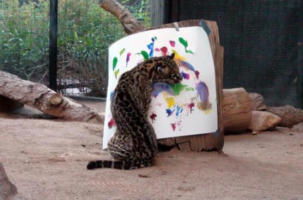 Пэдфут — любимец посетителей зоопарка города Феникс, штат Аризона. Обитатель тропических лесов Латинской Америки, оцелот считается редким видом, и далеко не каждый зоопарк может похвастаться таким экспонатом. А Пэдфут уникален вдвойне: он еще и обладает талантом живописца, который служители открыли в нем еще в 2004 году. Тогда этот кот только поступил в зоопарк и часто скучал. Чтобы развлечь его, смотрители решили прибить на стену вольера холст и сделать на нем несколько мазков краской. Оцелот скоро заинтересовался холстом и стал тереться об него шеей, головой, а потом всем телом. Такая техника в среде кошек-художников — редкость: обычно они используют передние лапы.