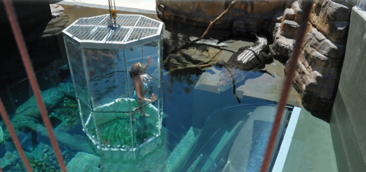 9.Это развлечение туристам предлагает водный парк Crocosaurus Cove, находящийся в австралийском городе Дарвин. Здесь в огромном многоуровневом аквариуме находятся гигантские гребнистые крокодилы. Это самый крупный и опасный вид крокодилов. Именно на их долю приходится наибольшее количество нападений на людей. Длина особо крупных особей может достигать 7 метров, а весят они почти тонну.