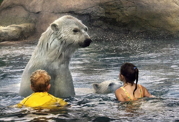 12. Плавание с белыми медведямиПоплавать с этими крупнейшими наземными хищниками, предлагают посетителям зоопарка Polar Bear Habitat, который находится в канадском городе Кокрейн. Конечно же, бассейны с людьми и с медведями разделены надежной перегородкой из пуленепробиваемого стекла, толщиною целых 9 мм. Но иллюзия абсолютной свободы получается полнейшая. Для организации подобного аттракциона потребовалось целых 20 лет. Зато успех у него колоссальный – только за первые полгода работы� «медвежий бассейн» посетили более 11000 человек.