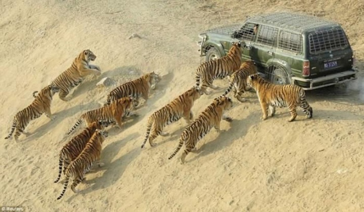 2. Туристов перевозят по территории парка в зарешеченных автобусах или автомобилях. Тигры испытывают самый живой интерес к этому транспорту и постоянно пытаются его открыть, с любопытством обнюхивают и всячески исследуют его на свой тигриный манер. Вид тигра, сосредоточенно пытающегося вскрыть зарешеченную дверцу автомобиля, обеспечивает пассажирам бурю незабываемых эмоций.