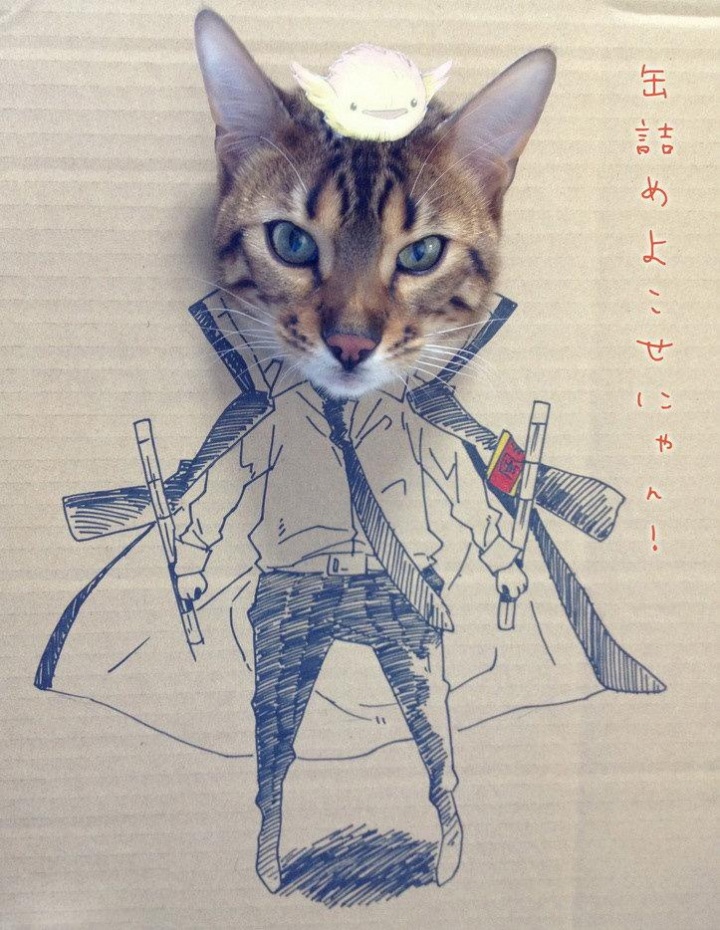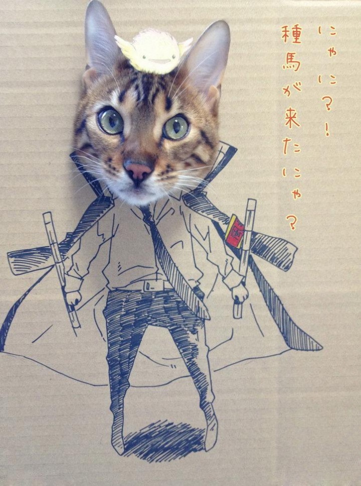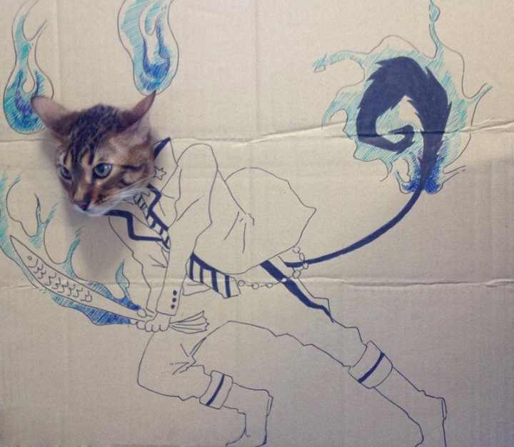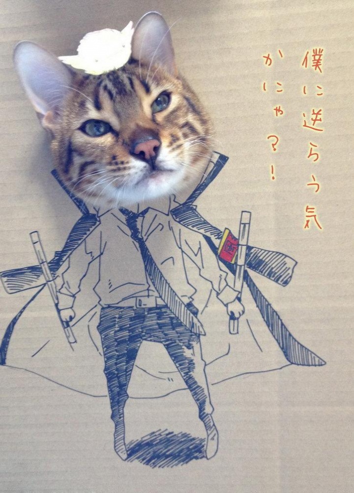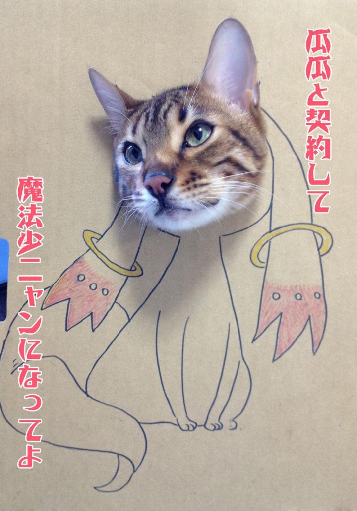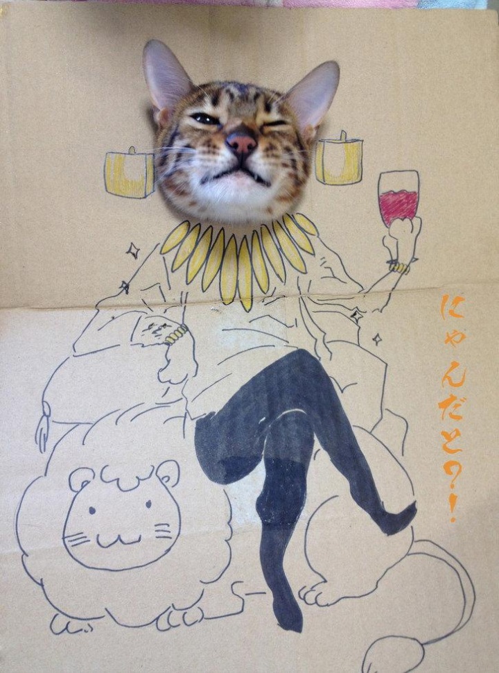 Странный подарок своей кошке по имени Гагуа на день рождения сделала китаянка с ником toshiya86 — пользовательница китайской службы микроблогов Sina Weibo. Взяла нарисованные на картоне сказочные и приключенческие образы и в дырки на месте их голов засунула голову кошки — по типу популярного пляжно-фотографического «прикола».