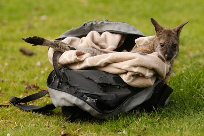 Кенгуренок Тилли, которого выращивали в этом рюкзаке, когда он потерял маму.