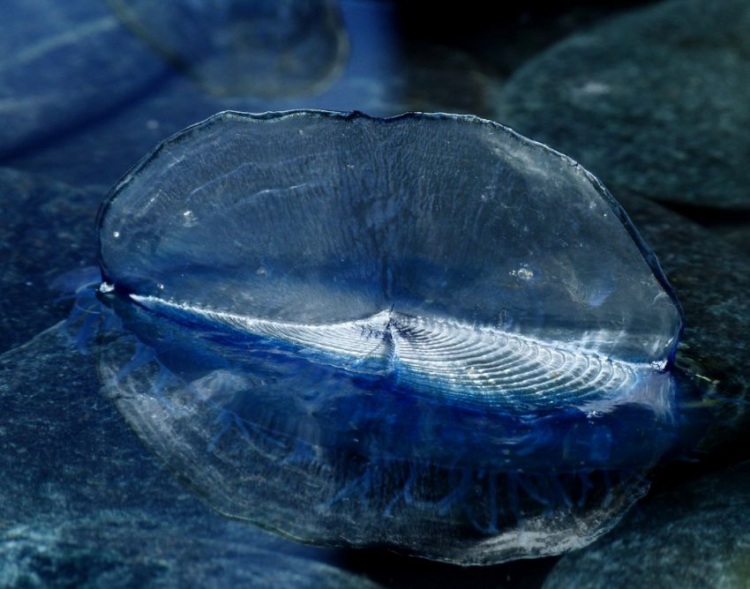 Плавает на поверхности воды. Среди особей данного вида существует примерно равное количество «правосторонних» и «левосторонних» экземпляров: различаются по тому, в какую сторону по диагонали от переднего конца у них скошен «парус»