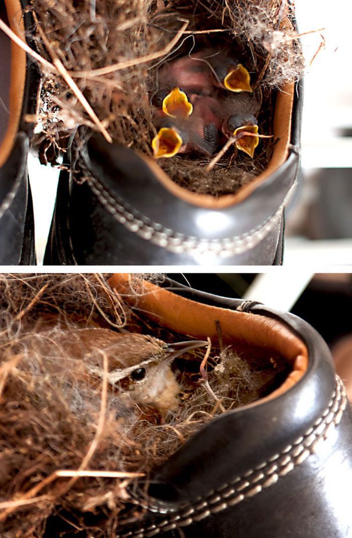 19. Гнездо каролинского крапивника в кроссовках для бейсбола.