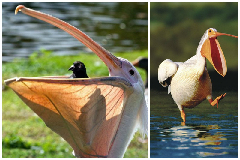 Клюв пеликана имеет горловой мешок, вместимостью около 5 литров. Вода, попадающая вместе с рыбой, вытекает через специальные отверстия снизу