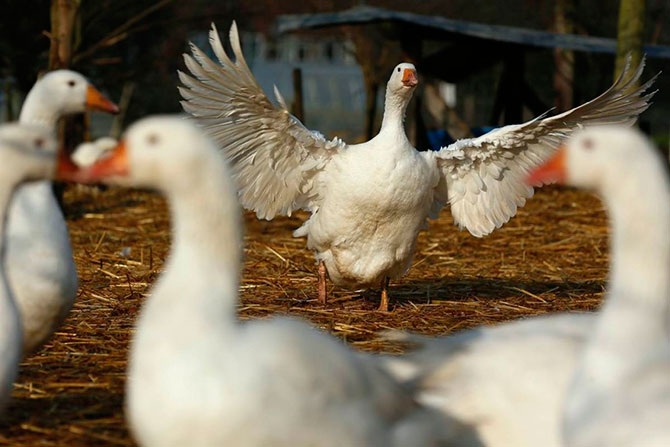 Гусь хлопает крыльями в поле на ферме «Church Farm» в Ардели на юге Англии, 12 декабря.