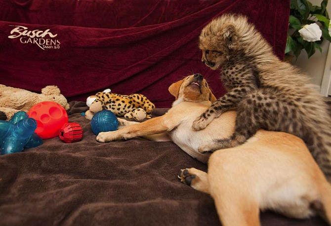 В национальном парке Флориды живут двое необычных друзей – гепард Каси и лабрадор Мтани. Маленький гепард остался сиротой, и в зоопарке решили подружить его с щенком лабрадора. С тех пор прошел уже год, а эта парочка до сих пор неразлучна.