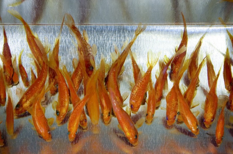 Художник создал коллекцию трехмерных изображений маленьких золотых рыбок и других представителей подводного мира, нарисованных в разных емкостях с использованием прозрачных смол, смешанных с акриловыми красками.