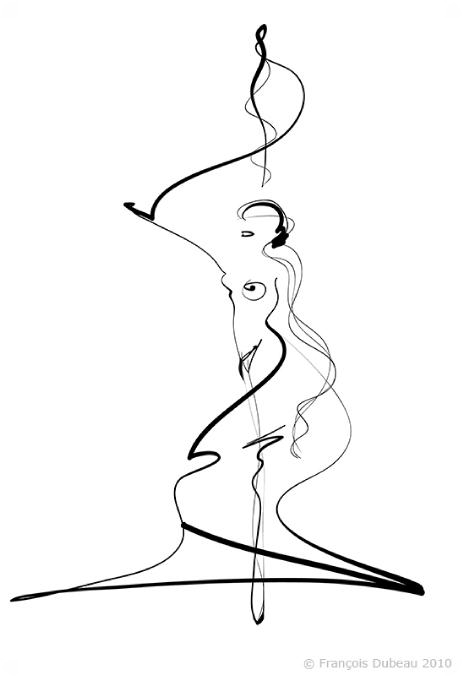 Умеет парочкой линий, за которыми бежишь глазами, задать эстетику, настроение и даже небольшой сюжет. Росчерк цифрового пера, тонкие линии с утолщениями, штрихи, быстрыми и мимолетными движениями превращают их в световой силуэт, каллиграфическую арабеску, непревзойденную легкость и тонкость.