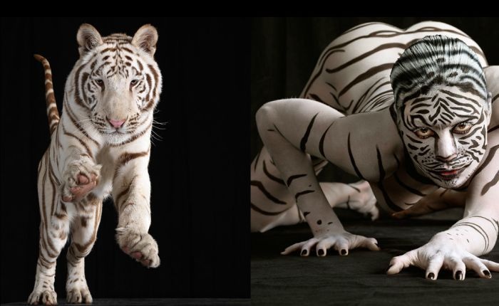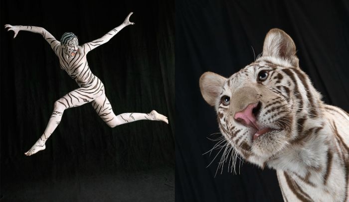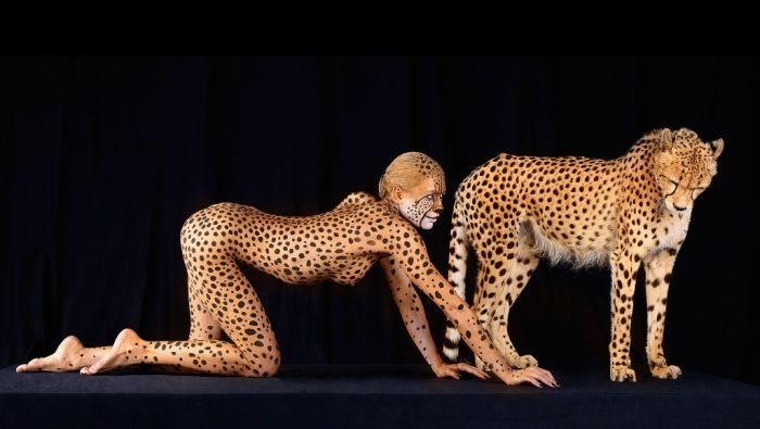 Фотограф Леннетт Ньюэлл провел фотосессию с участием животных и обнаженных моделей, при этом тела моделей были раскрашены в цвета тех или иных представителей животного мира.