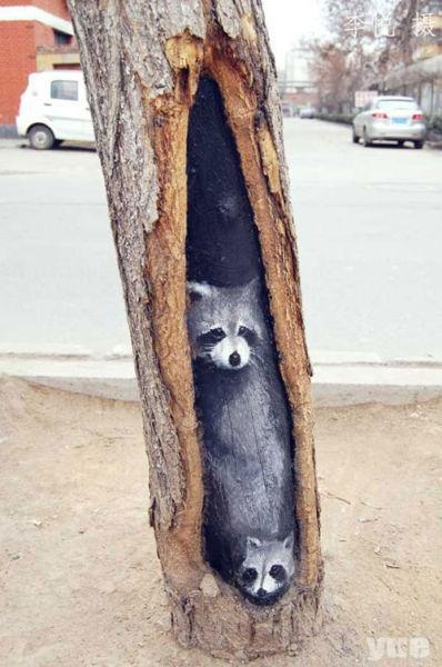 23-летняя студентка искусства, Ван Юэ, использует отверстия на стволах деревьев по всему городу Шицзячжуан в Китае, как холст для ее последних работ. Каждая картина занимает около двух часов.
