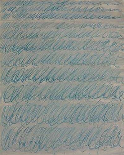 Эта картина Сая Твомбли продана за 2,3 миллиона долларов на аукционе Кристи. Эта работа выполнена цветными карандашами на бумаге, то есть примерно так же, и теми же материалами, которыми в детском саду пытаются выводить первые буквы. При косом взгляде это похоже на то, как пятилетний малыш отрабатывает написание буквы «е», не так ли?