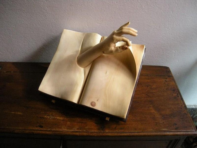 Деревянные книги Нино Орланди с названиями «Книга Жизни», «Волшебная гора» и «Книга мечты».