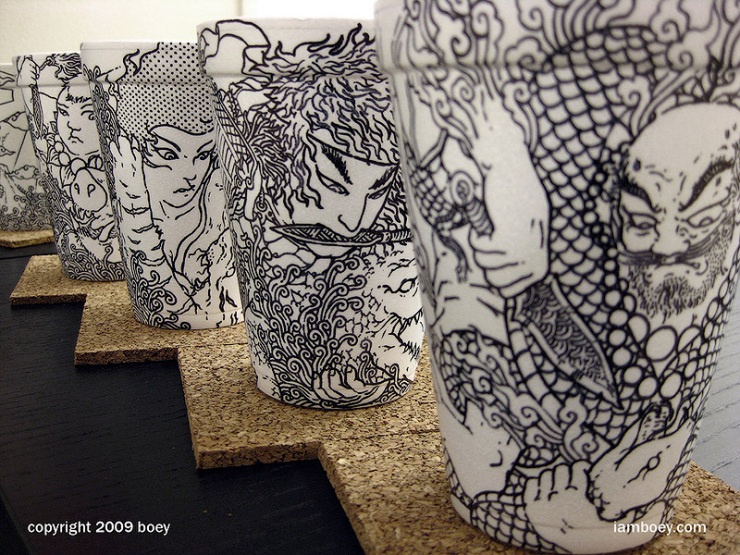 Не найдя под рукой ручки и бумаги, художник Чеминг Бои сделал набросок на одноразовом стаканчике для кофе. Идея использования нестандартной поверхности настолько увлекла мастера, что он начал создавать на бумажных чашках рисунки. Подобный формат живописи автор практикует с 2006 года. С помощью обычного черного маркера он расписывает стаканчик, нанося на его поверхность рисунки на различные темы. Его работы были признаны формой современного арта. Цена на такое произведение искусства варьируется от 120 до 220 долларов.