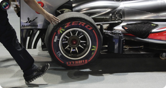 22. Техники команды McLaren загоняют болид в гараж после прокола шины во время квалификационного заезда, 24 сентября 2011 года. (REUTERS/Tim Chong)