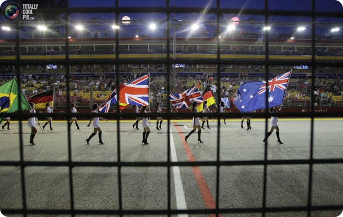 24. Девушки из команды поддержки с флагом Сингапура во время открытия Гран-при 25 сентября 2011 года. (REUTERS/Tim Chong)