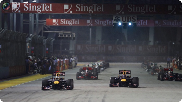 26. Себастиан Феттель (слева) из команды Red Bull во время старта Гран-при Формулы 1 в бухте Марина, Сингапур, 25 сентября 2011 года. (REUTERS/Michael Caronna)
