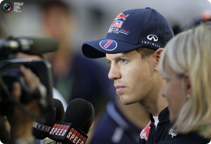 3. Пилот Себастиан Феттель из команды Red Bull на телевизионном интервью перед Гран-при Сингапура на трассе в бухте Марина, 22 сентября 2011 года. (REUTERS/Tim Chong)