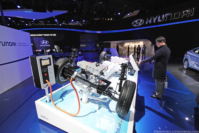 12. Электромобиль от Хёндай и его устройство. Новинками же стали Veloster Turbo и Genesis Coupe (увы, не увидел их). Но вообще к презентациям Хёндай было повышенное внимание. Видимо дают они жару американцам