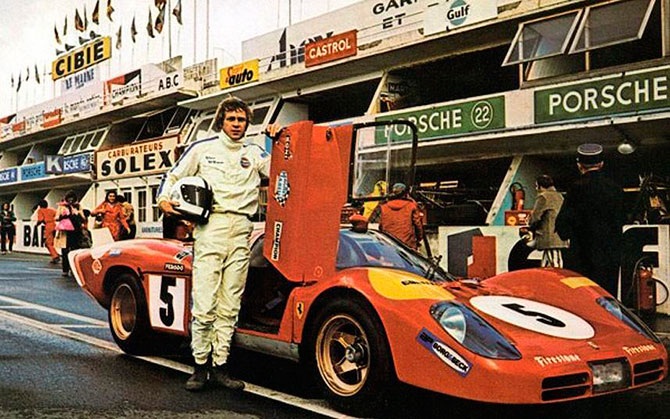 На фото Стив Маккуин и автомобиль Ле-Мане. Действия фильма происходят на гонке 1970 года, где за золото сражаются немец на Ferrari и американец на Gulf Porsche