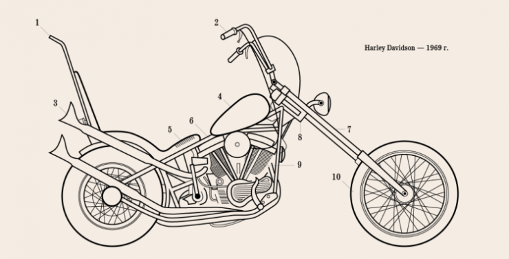 В 1960-х культура кастомайзинга после работы исключительно на скорость и легкость окунулась в эпоху выпендрежа, китча и нонконформизма. После многих лет скоростных и мощностных доработок без оглядки на стиль и красоту пришло время ярких, стильных и чрезвычайно вычурных модификаций. В первую очередь под нож пошли рамы — доработка коснулась угла установки передней вилки. Многие байкеры, конечно, до сих пор утверждают, что основная фишка чопперов — безумная длинная вилка с диким рейком — изначально была абсолютно утилитарной. По-своему это верно — длинная вилка под большим углом позволяет очень уверенно, хоть без рук, ехать по прямой дороге, коих в Штатах очень много. Но вот поворачивать и маневрировать сложнее в разы, уж тем более если вилка выше человеческого роста. Недаром во многих штатах есть законы, ограничивающие длину вилки и угол ее установки, как и высоту руля.