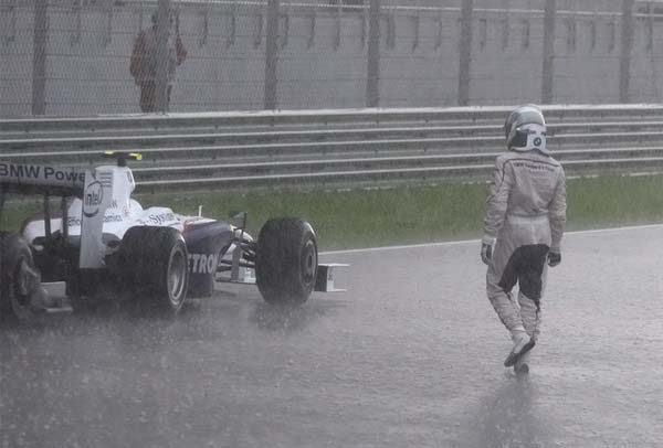 Немецкий пилот из команды BMW Sauber Ник Хайдфельд (Nick Heidfeld) идет к своей машине на трассе Сепанг в Куала-Лумпур, Малайзия. Воскресенье, 5 апреля 2009. В этот день Гран-при Малайзии был остановлен из-за проливного дождя. (AP Photo/Bazuki Muhammad, Pool)