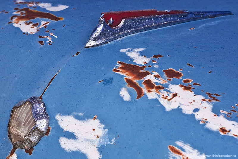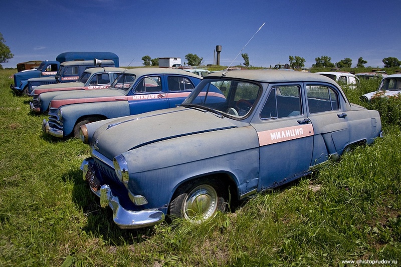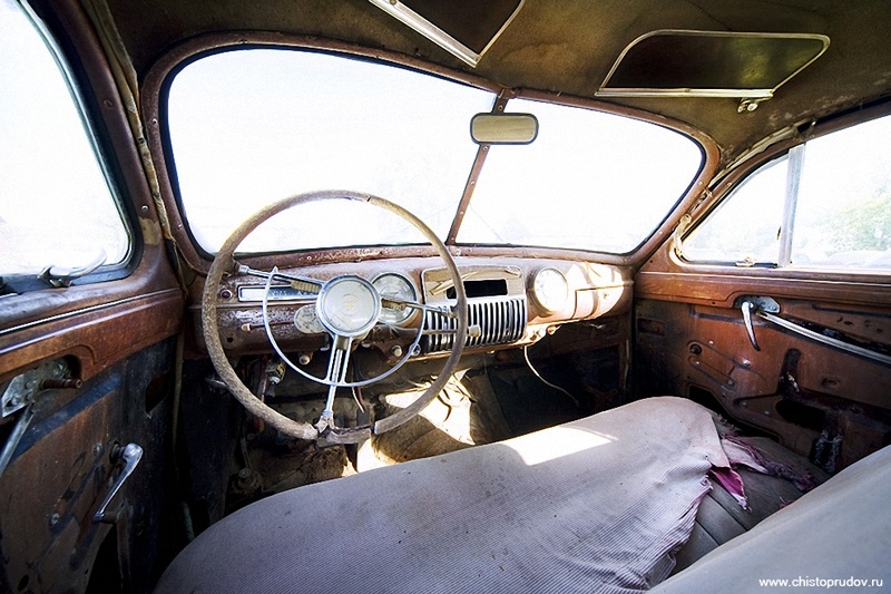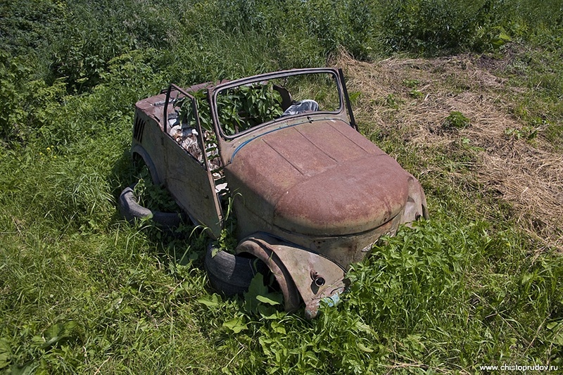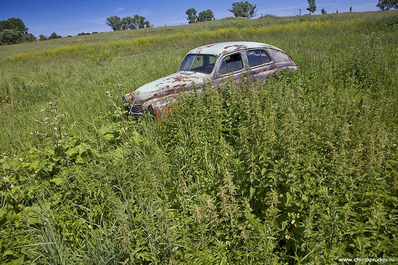 Заросший травой «Москвич-401», на заднем плане семейство Газиков.