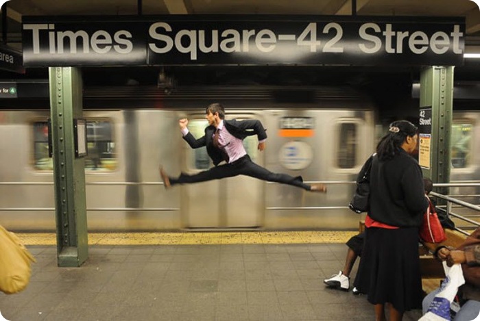 Стараясь осветить танец в обычной повседневной ситуации – будь то в метро на 42-ой улице или в Музее естествознания – Джордан хочет, чтобы фотографии выглядели органично. «Через драму фотографии я хотел объяснить, как бы танцор отреагировал на дождь или повел себя в магазине «Apple» или бы просто выпил кофе». На фото: Джеффри Смит у поезда номер 2. (JORDAN MATTER PHOTOGRAPHY / BARCROFT USA)